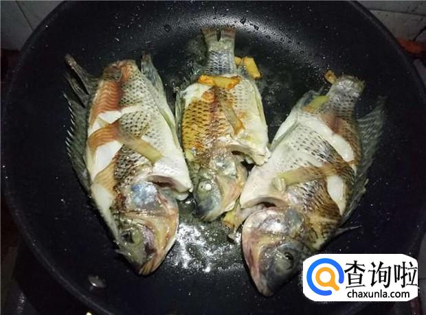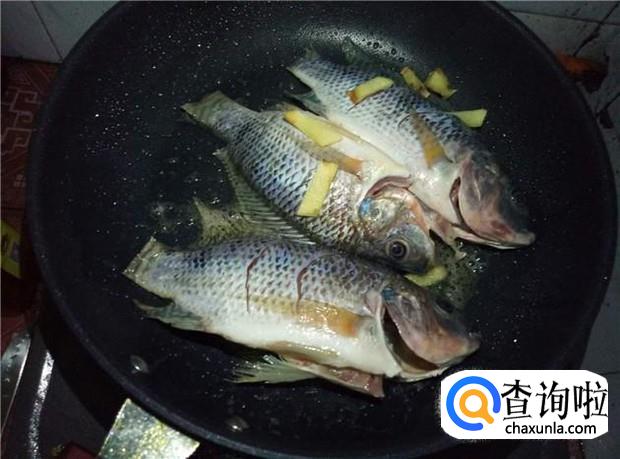 把火调为最小,油热后,放入罗非鱼,等到鱼尾翘起来后,里面翻另一面煎。