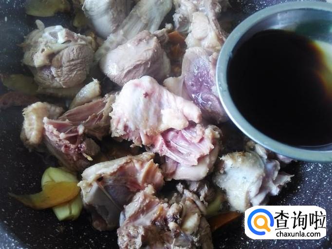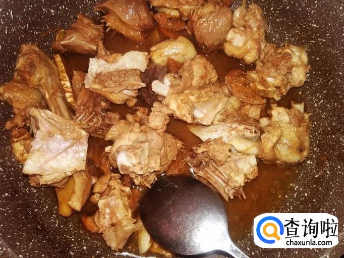 翻炒至鸭肉变色,然后加1勺生、1勺料酒翻炒一下,再下2小勺水进去。