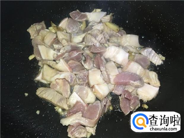 热锅下油,放入姜蒜煸香,再倒入腌制好的五花肉,大火翻炒。