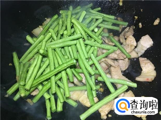 把五花肉煎一会,然后再倒入豌豆角,加入适量的盐,把豌豆角炒软。