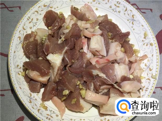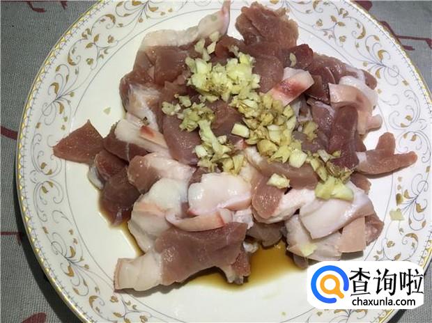 五花肉清洗干净,加入适量的花生油、酱油、蚝油,再加入剁碎的蒜蓉和姜末,一起搅拌均匀,腌制10分钟。