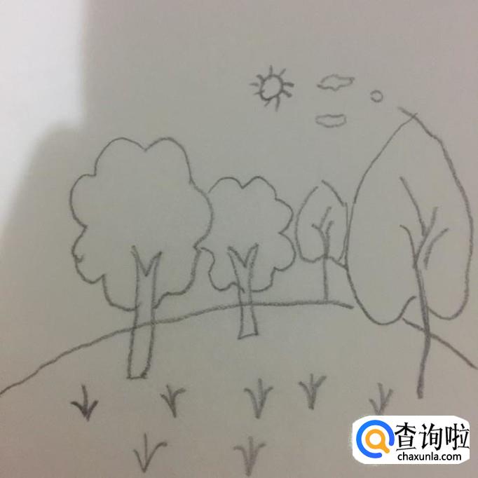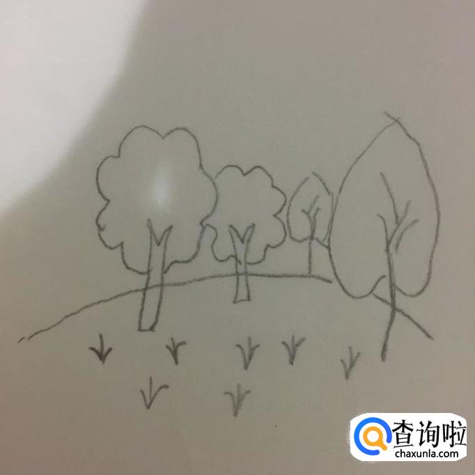 接着在树木的下方画上一些小草,如下图所示。