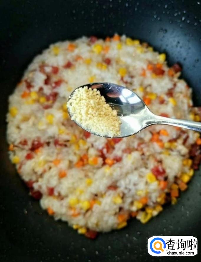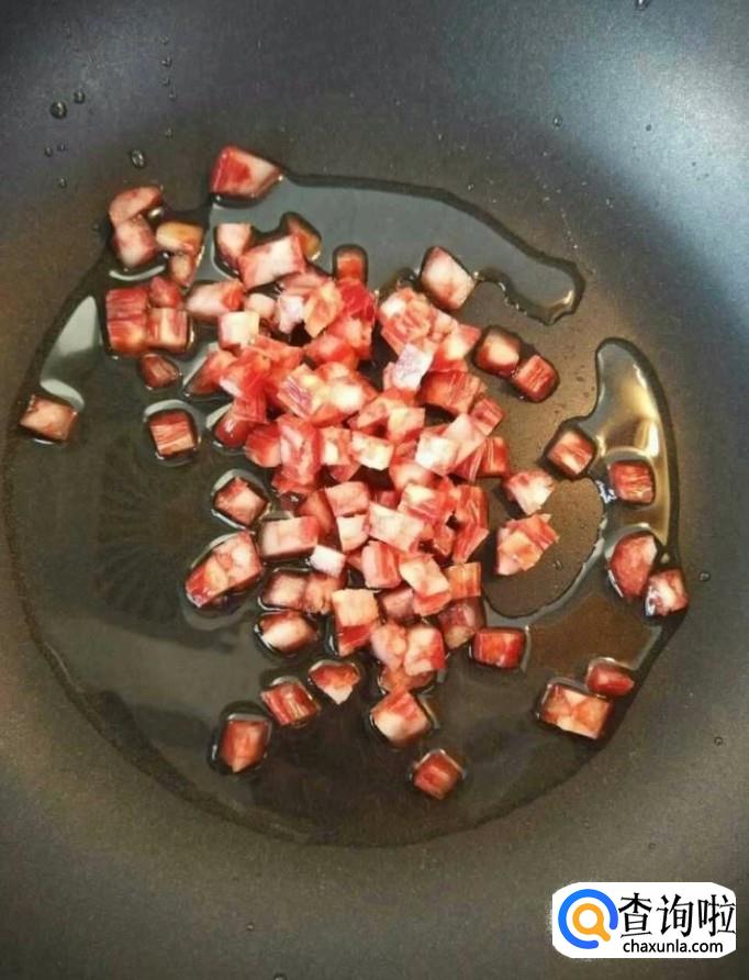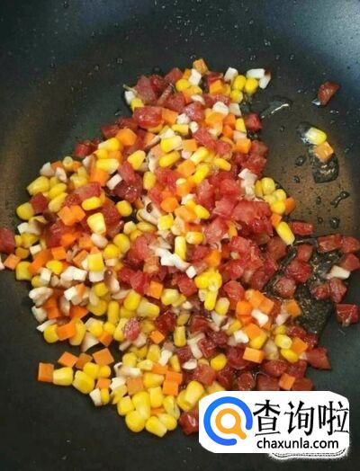 然后我们在锅中放入少许油,放入腊肠丁炒熟,再放入香菇,胡萝卜,玉米粒炒熟,再放入煮好的糯米,加入适量的盐,鸡精,生抽调味,炒好以后备用