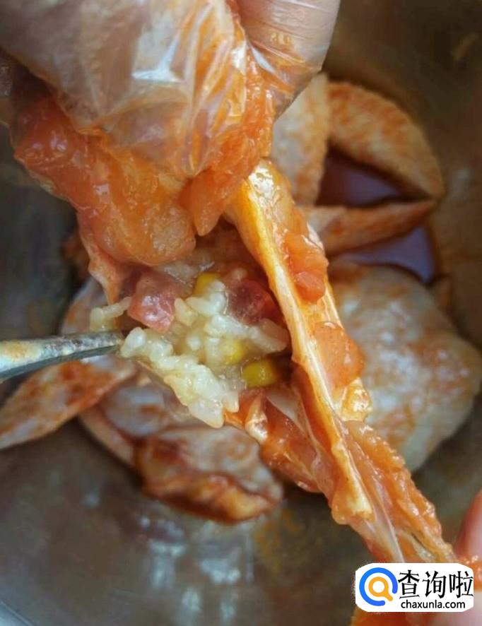 接着我们将炒好的米饭用勺子灌入鸡翅中,用牙签固定好
