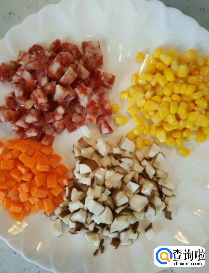 接着我们将胡萝卜,香菇,腊肠切丁,玉米粒清洗干净备用