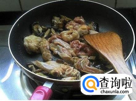 捞出鸡肉,砍成一小坨一小坨的,放入煎锅中煎制,5分钟后加一点点白酒,翻炒。