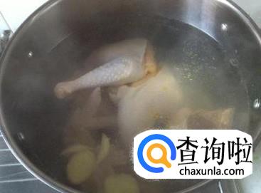 鸡肉在加盐与生姜的水中煮30分钟去腥味。