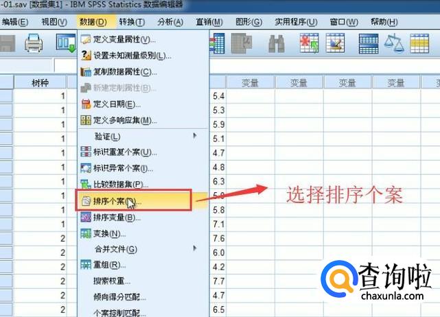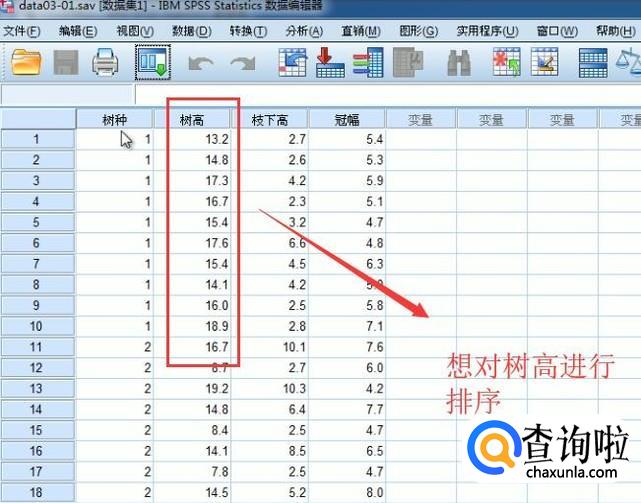 然后数据导入进SPSS中以后我们就可以针对某一列进行排序了,比如我想对树高列进行排序