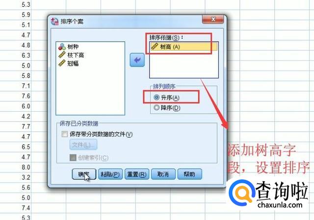 接下来在弹出的排序个案界面中将树高字段添加到排序依据里面,然后选择升序,如下图所示