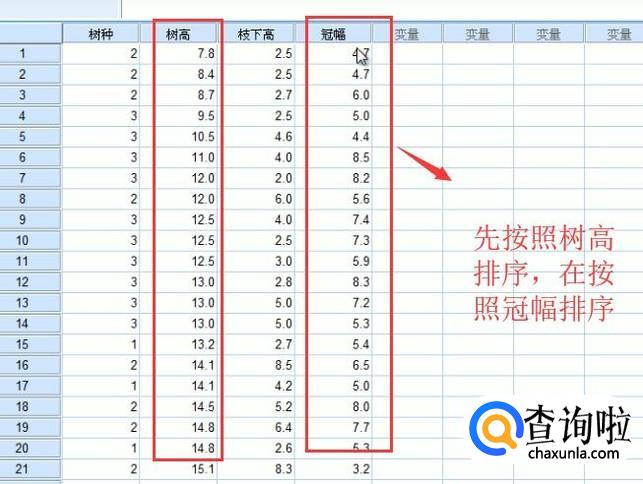 最后点击确定以后,SPSS就会将数据先按照树高升序排序,在按照冠幅降序排序,如下图所示