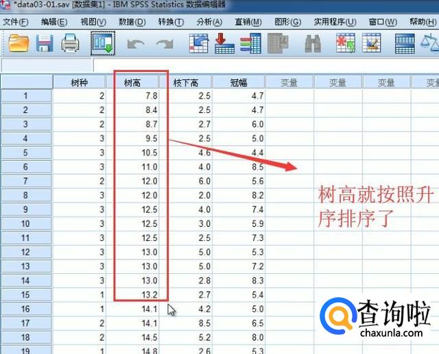 然后我们回到SPSS主界面,这个时候我们就可以看到树高列已经按照升序排序了,如下图所示