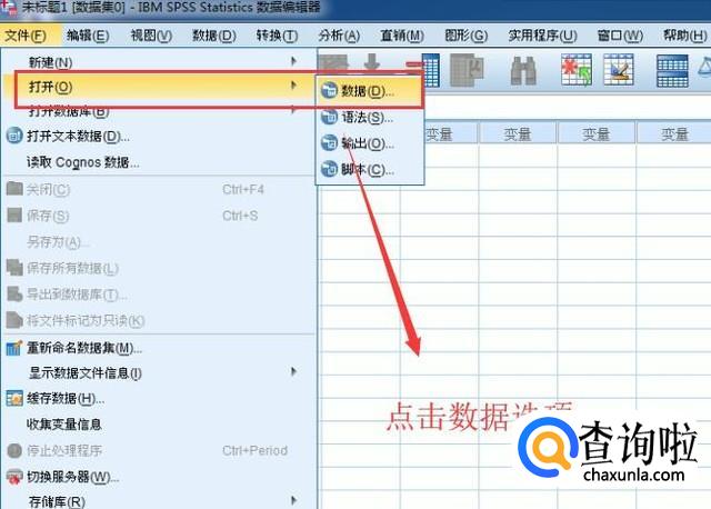 首先打开SPSS软件,点击左上角的文件菜单,选择下拉菜单中的数据选项,如下图所示