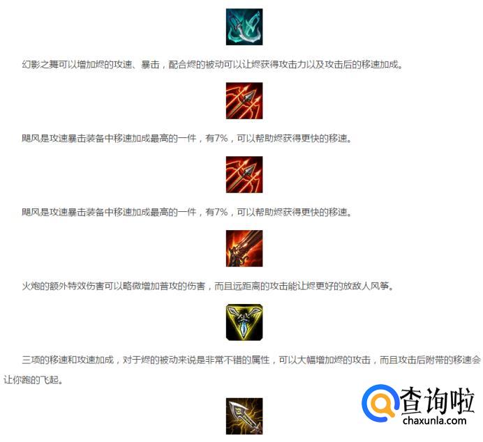 火炮、电刀、幻影之舞提高攻速,强化烬的攻击力,并且这三件装备有额外的移速加成。 轻灵之靴保证烬最大程度能够保持恒定的高速。