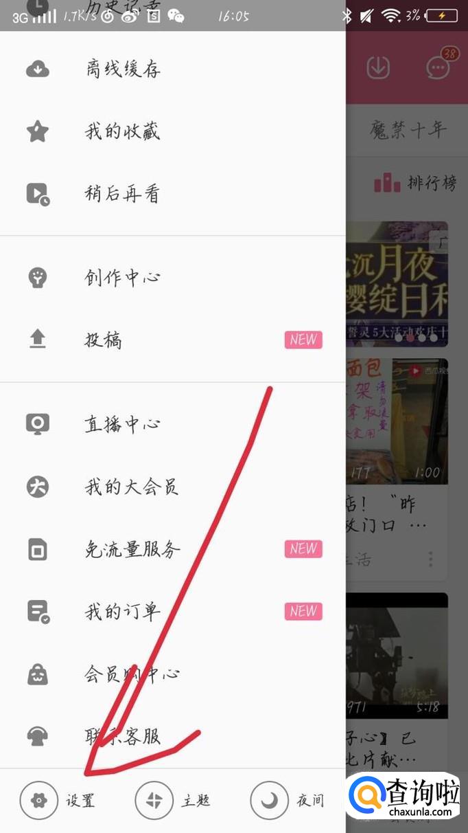 点击左上角自己的头像,如图1箭头所示。会出现一个新的界面,点击左下角的“设置”选项,如图2箭头所示。