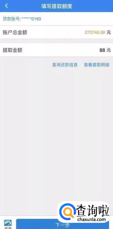 进入提取界面,在可提取金额范围内填写提取金额,然后点击【下一步】。