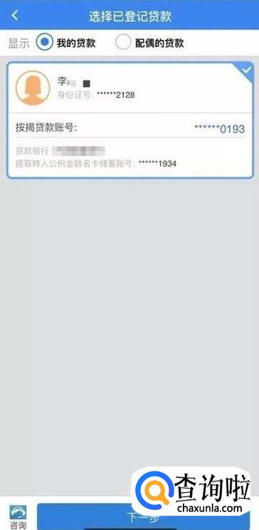 进入选择贷款界面,选取已登记的贷款并点击屏幕下方的【下一步】。
