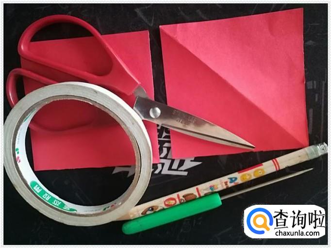 准备2张自己喜欢的红色彩纸、1把剪刀、一支铅笔、一个锥子、适量的双面贴