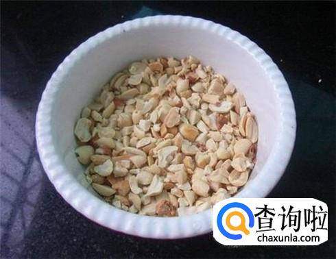 花生清洗干净,晾干水分,翻入锅中翻炒几分钟,捞起来用刀子压碎。