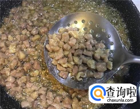 热锅下油,放入牛肉翻炒均匀,然后再倒入适量的豆瓣酱、老干妈、五香粉、料酒、盐,把牛肉粒炒熟。