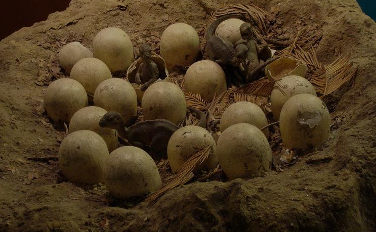 目前还没有任何的证据可以证明恐龙能够像鸟儿一样在树上产蛋,这很大程度上是因为蛋必须埋藏在地下才能变成化石。即使恐龙能够在树上筑巢,“覆巢之下安有完卵”,蛋也无法平安地落到地面保存下来。所以,我们看到的恐龙蛋窝,都是在地面筑巢的恐龙留下的。它们或者像海龟一样挖坑,把蛋埋起来;或者清理出一片平地,将蛋按一定的次序产在上面;或者筑起一个碗形的巢穴,将蛋产在里面(如慈母龙);或者堆起一个小土堆,让蛋斜靠在上面(如长形蛋)。还有一些恐龙蛋,它们的埋藏方式没有什么明显的规律,以至于科学家无法推断它们的妈妈是如何筑巢的。