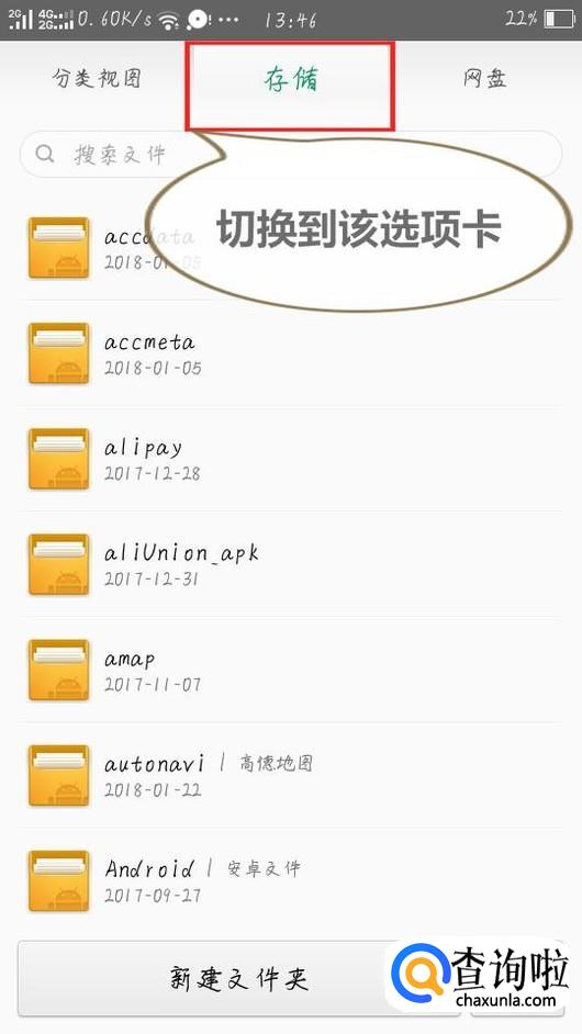 在桌面打开文件管理,文件管理中有“分类视图”“存储”“网盘”三个选项卡,切换到“存储”选项卡