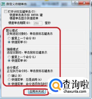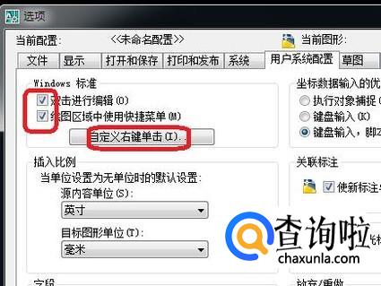 如图所示,勾选“双击进行编辑”和“绘图区域使用快捷菜单”,应该就能解决快捷键无法使用的问题了。我们再点击“自定义右键单击”,进去设置一下。