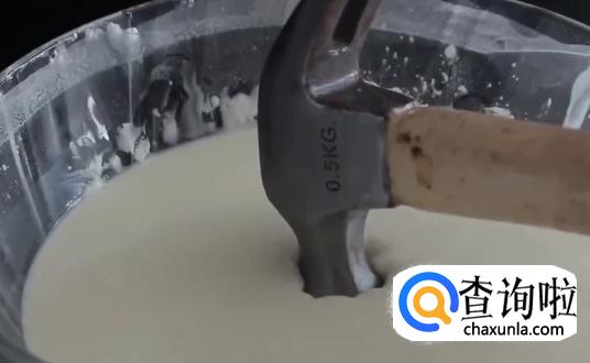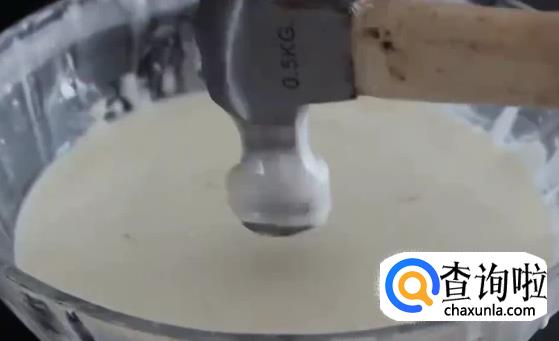 举个例子:当你用锤子慢慢放入非牛顿液体中时,可以进去,但如果你非常用力的敲击非牛顿液体表面,你会发现淀粉表面非常的硬。
