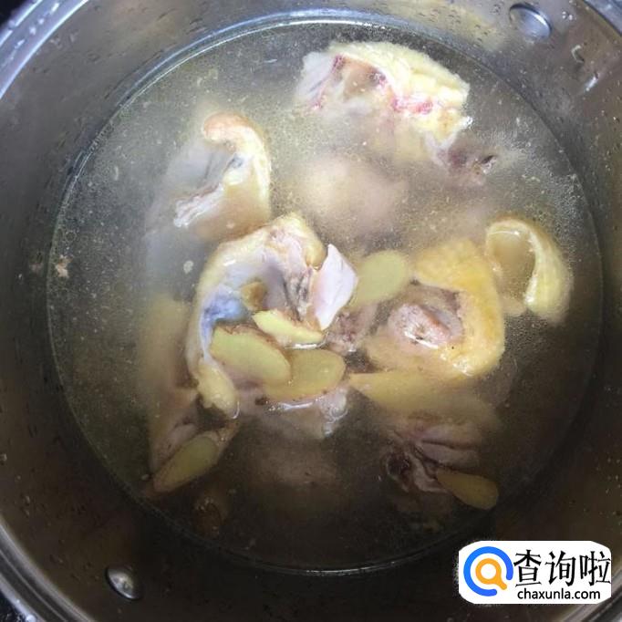 接着往汤锅中加入适量的清水,待水烧开,倒入鸡肉煮到沸腾。