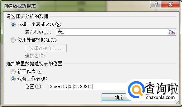 在弹出的创建数据透视表对话框中,选择现有工作表,将位置选到工作表右边的空白区域。