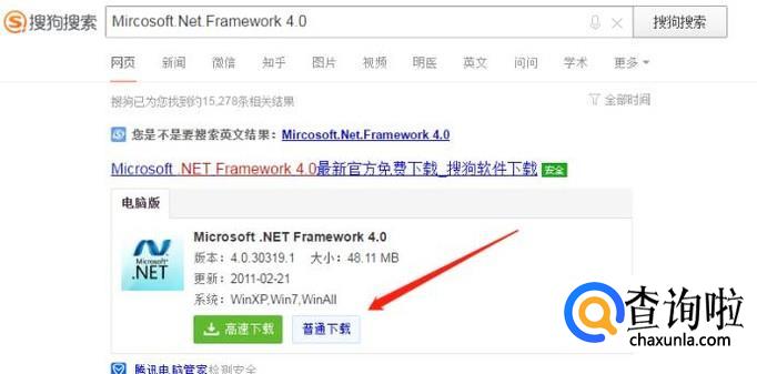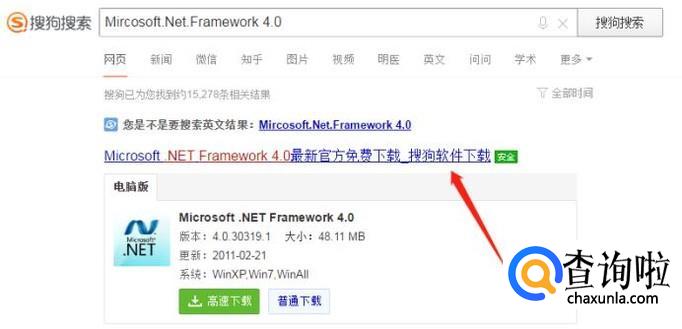 首先我们打开搜狗搜索引擎搜索“Mircosoft.Net.Framework 4.0”出现结果,