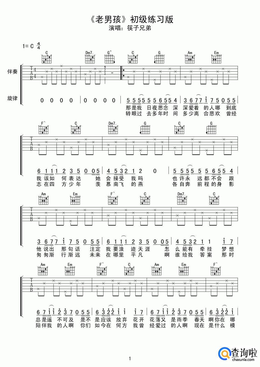 老男孩吉他谱c调简单原版到处在网络上到处都可以找到,现在分享的是一个初级的练习版本,很不错哦。图1: