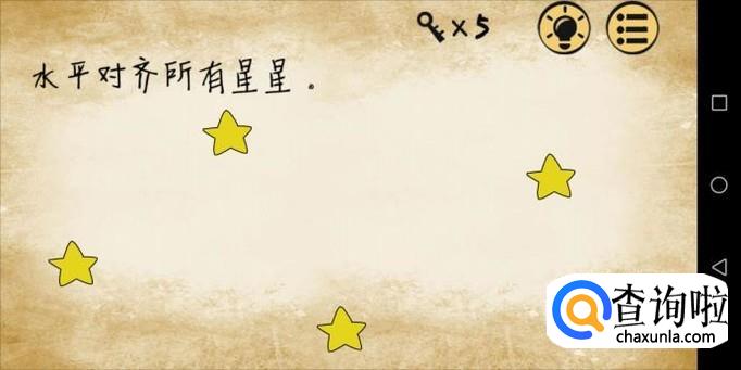 本关要求水平对齐所有星星,除了对其四颗黄色星星外,千万不要忽略还有“星星”二字也属于星星的行列,将星星图案和星星汉字对其,即可顺利通关。 - 02