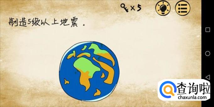 本关要求造成五级以上地震,地震就是剧烈的摇晃,本关只要我们大幅度晃动手机即可顺利通关。