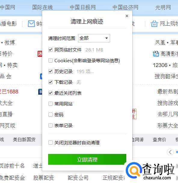 如果你需要每次都这样不保留痕迹,那就勾选最下面“关闭浏览器时自动清理”这样就不用每次清理了。