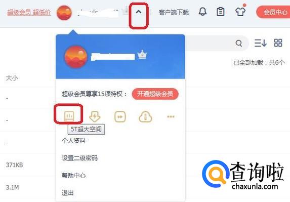 用账号密码登录以后,点击右上角用户名,出现下拉菜单,我们点击图中所示的“5T”超大空间按钮。