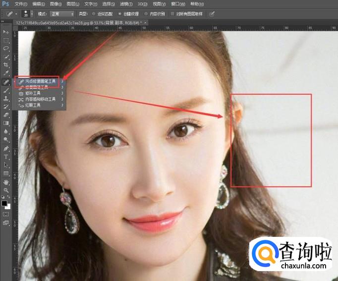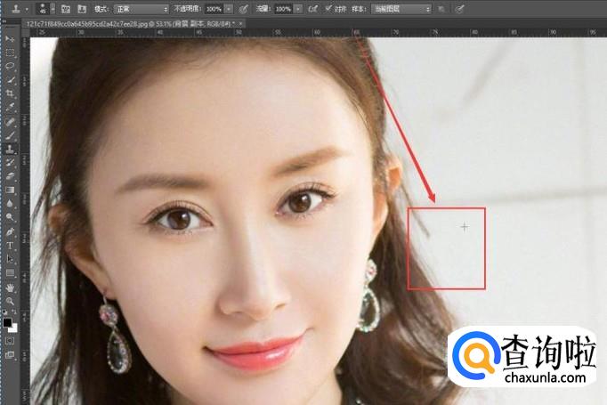 选择“污点修复画笔工具”,轻轻涂抹发丝所在的区域,让该区域和周围环境彻底融合。