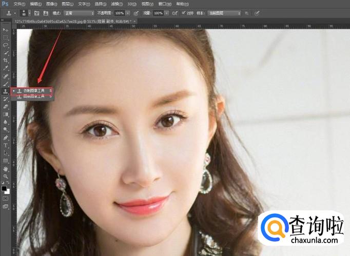 选择“仿制图章工具”,按住Alt键在照片上点选和发丝周围环境差不多的取样点,然后一点点涂抹多余的发丝。