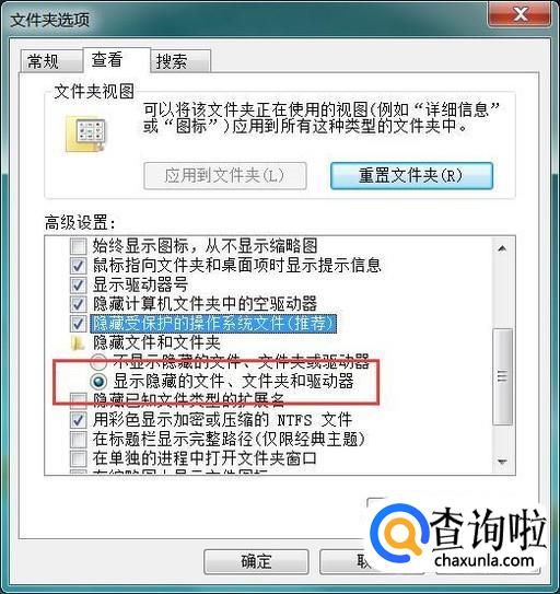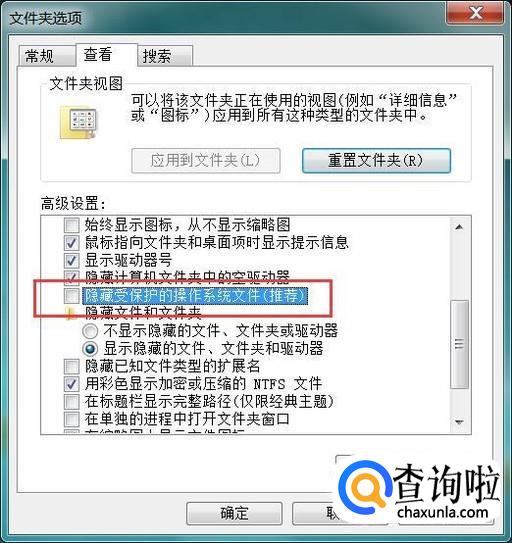 同时,我们还要注意取消勾选“隐藏受保护的操作系统文件”复选框,然后点击页面中的“确定”按钮,保存该项设置。