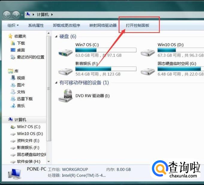 首先,请大家打开Win7系统中的计算机界面,选择打开“控制面板”选项。