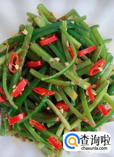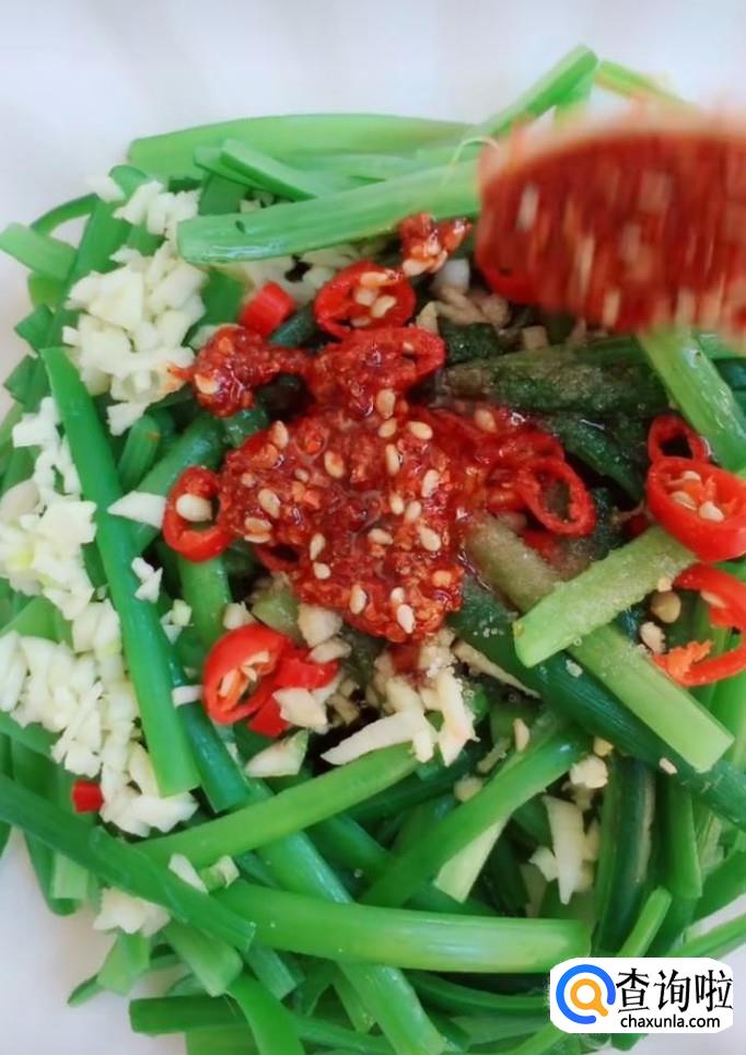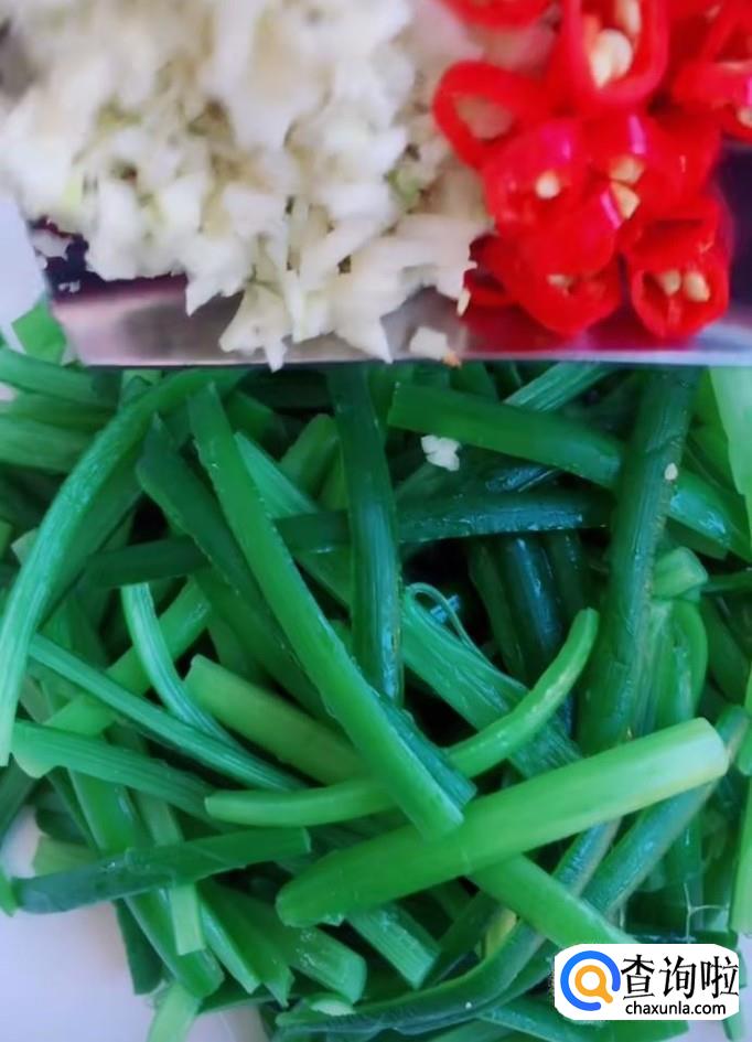 然后我们将苔菜过凉控水,用牙签划开,放入碗中,加入适量的蒜末与小米辣