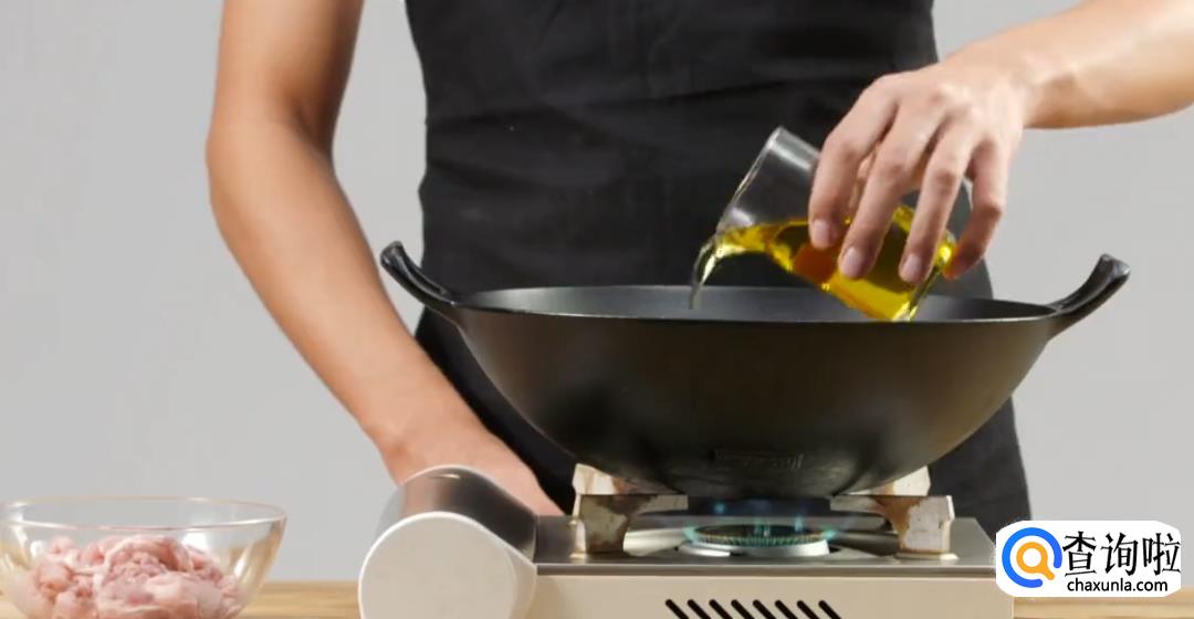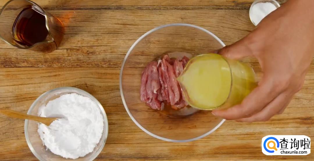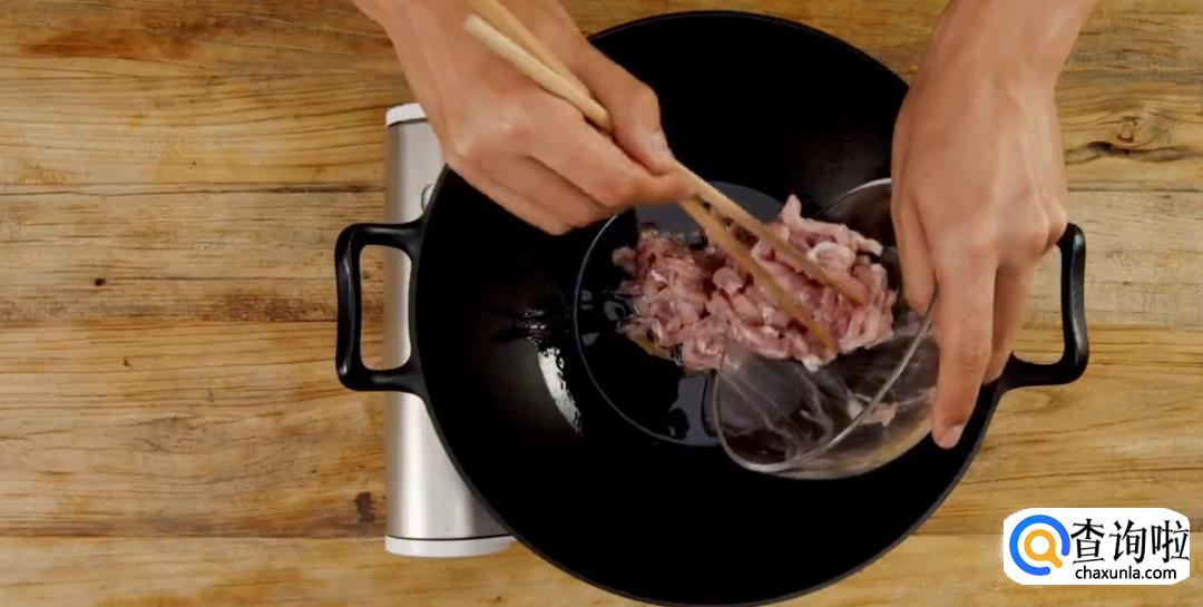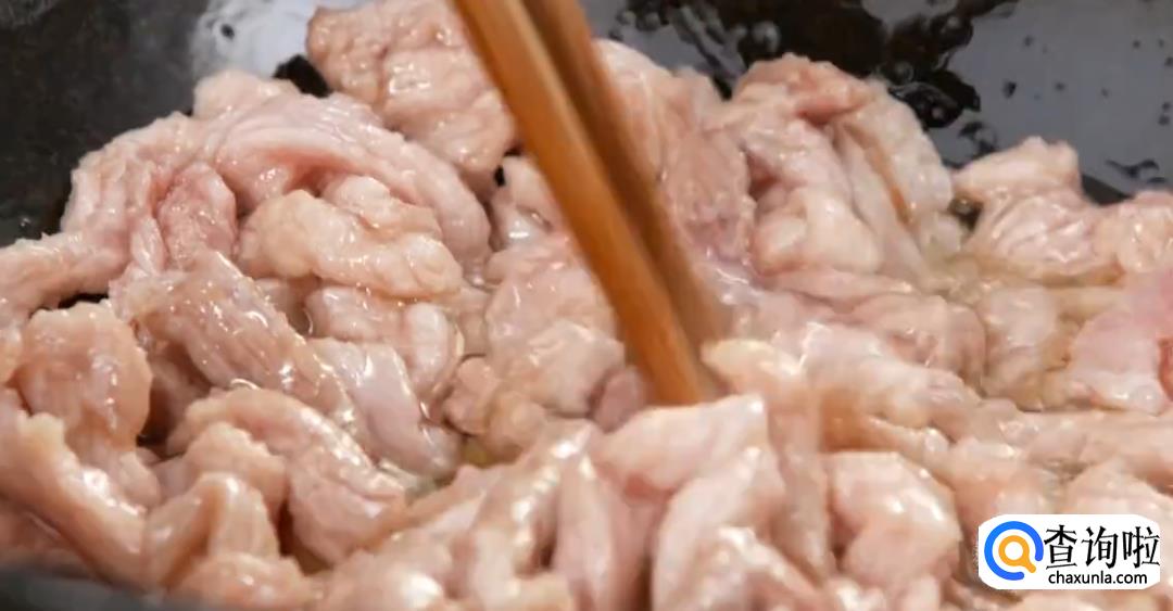 热锅起油,将腌制好的肉丝下锅,然后用筷子翻动搅拌,最后滤油捞出。