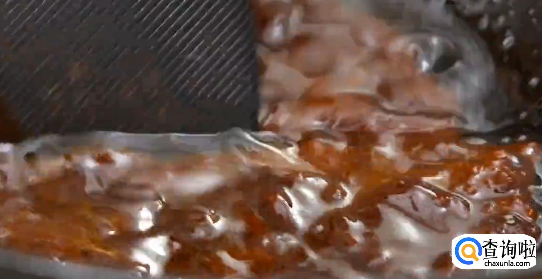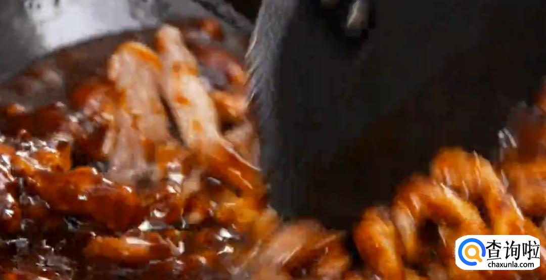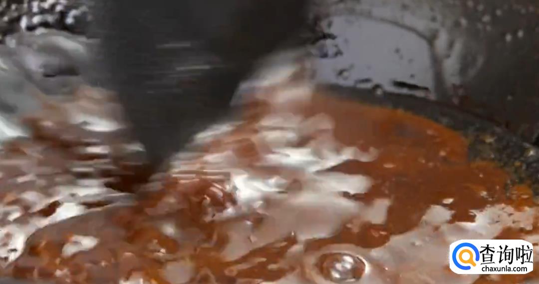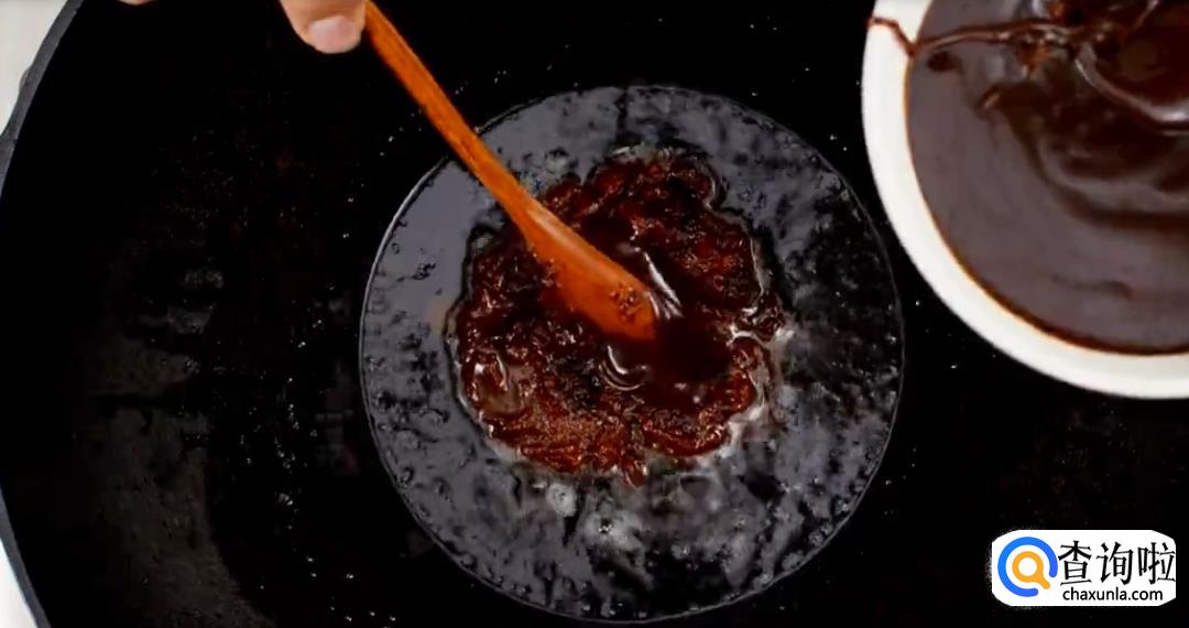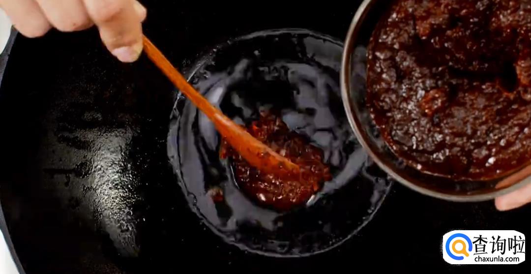 在锅中留一点油,依次下豆瓣酱,甜面酱,料酒,姜汁和糖,不断搅拌翻炒。