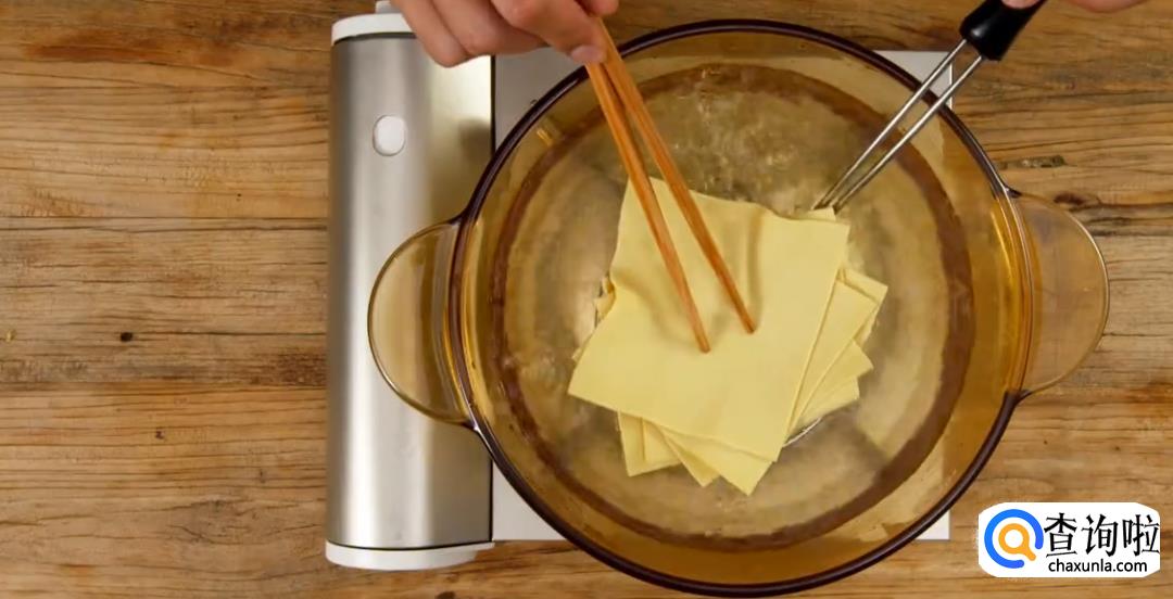 将整块的豆皮切成大张,然后进入沸水焯水,捞出后滤干。