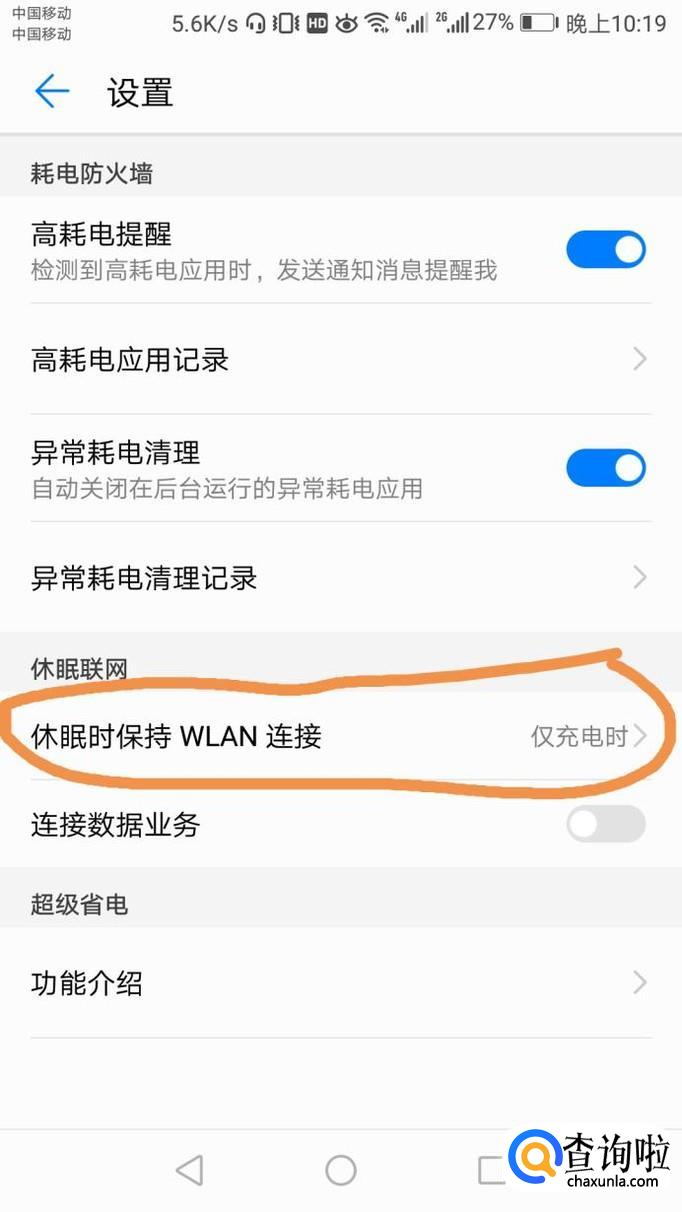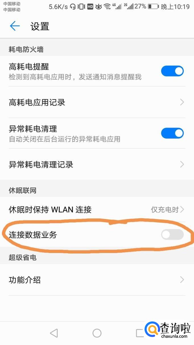 接着会直接返回下图界面,找到“连接数据业务”,并打开,就解决华为荣耀锁屏休眠后自动断网的问题了,如图