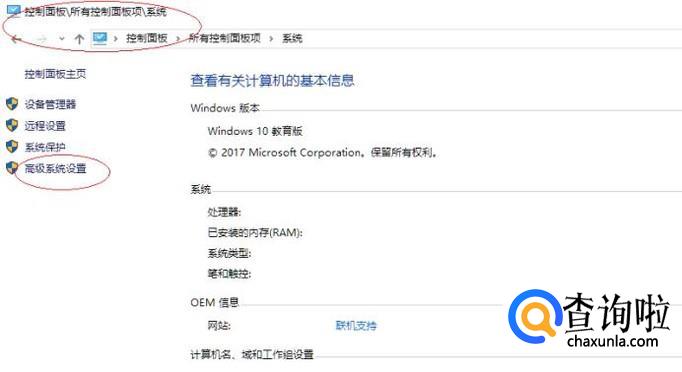 唤出"系统"选项界面,如图所示。点击左侧"高级系统设置"图标,下步将进行调整电脑虚拟内存不足的操作。