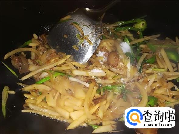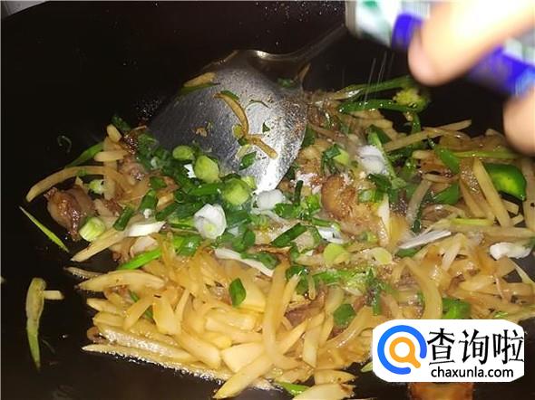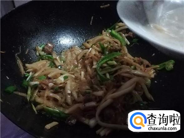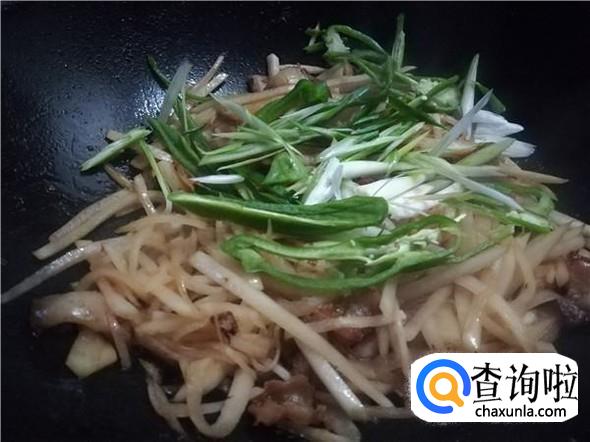 翻炒两三分钟后把青椒丝和蒜白丝倒进锅里,继续翻炒。