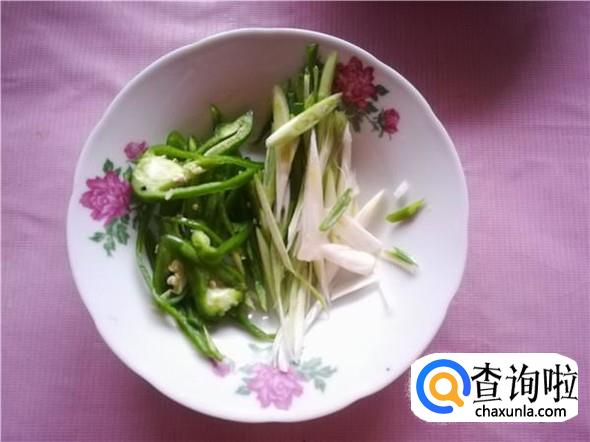 将蒜白和青椒切丝备用。