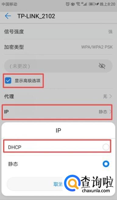 之后我们点击勾选上显示高级选项,然后我们点击IP,弹出的界面,我们点击DHCP;