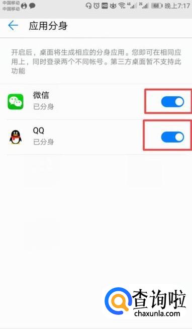 弹出的界面,我们将QQ和微信的分身开关向右滑动打开,结果如图所示,之后我们就可以同时登录两个QQ和微信了。
