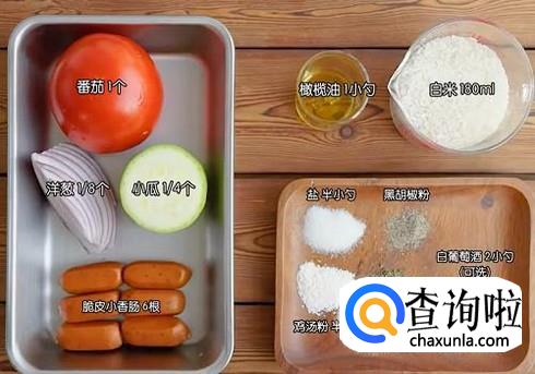 然后加入已经切好的小瓜洋葱和脆皮肠,并且加入调料:盐,鸡汤粉,百里香碎以及黑胡椒,